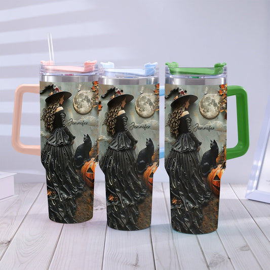 Beautiful Witch & Her Black Cat - Personalized Witch Tumbler With Handle