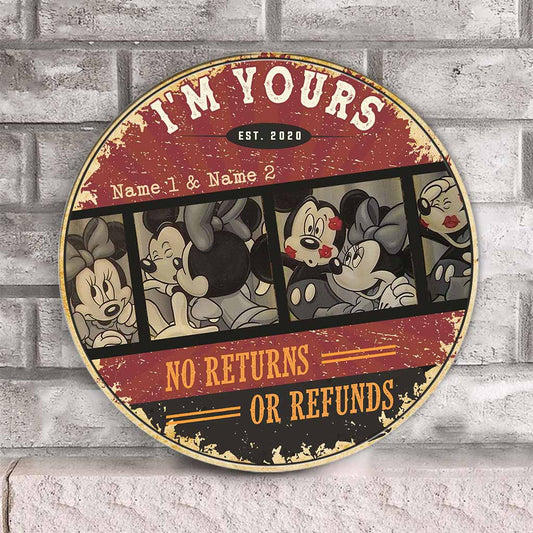 I'm Yours No Returns Or Refunds - Personalized Couple Mouse Round Wood Sign